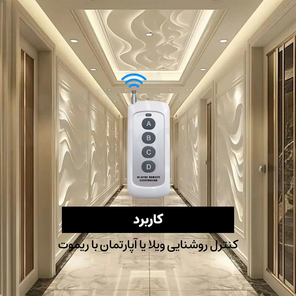 روشنایی داخلی ساختمان : منظور از روشنایی داخلی ساختمان ( هالوژن ها ، لوستر و مهتابی ها ) می باشد که میتواند با نصب آسان این محصول به راحتی تک تک این محصولات روسنایی را کنترل کنید.